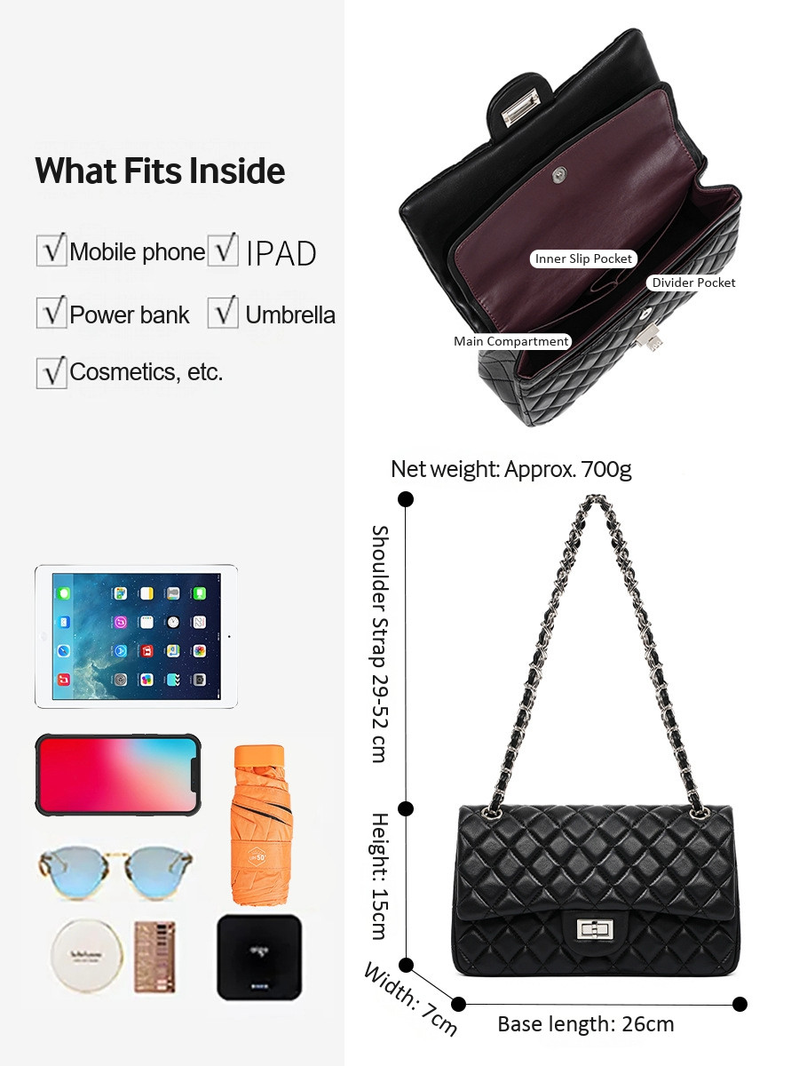 El estilo no debería implicar renunciar a la funcionalidad. Al abrir el Quilted Chain Bag, encontrarás un interior inteligente con compartimento principal, bolsillo interior abierto, separador y bolsillo trasero. Esta organización por capas mantiene tus básicos en su sitio. Lleva iPad mini, móvil, power bank, gafas, paraguas y cosméticos sin desorden. La apertura amplia facilita el acceso, y la estructura evita que se vea voluminoso. Cada vez que buscas algo dentro, el orden te recuerda que tu día sigue organizado, igual que tu imagen.