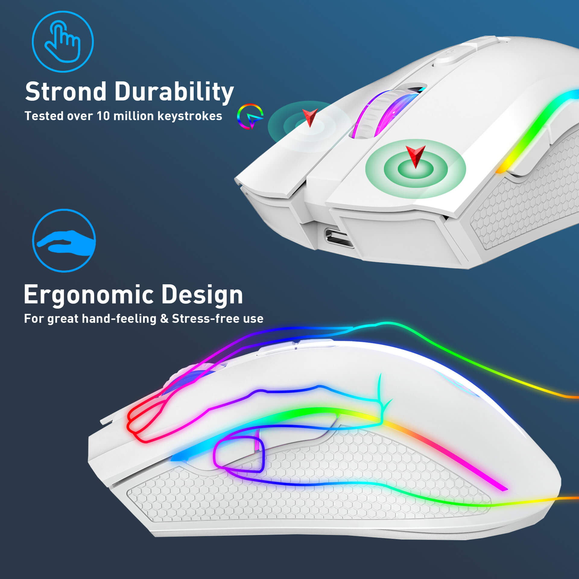 Votre espace de travail doit refléter votre style. Avec le rétroéclairage RGB de cette souris, vous obtenez plus que de la fonctionnalité : vous ajoutez une vraie personnalité visuelle. Plusieurs modes d’éclairage vous permettent de créer une ambiance adaptée à votre environnement. Effet arc-en-ciel pulsé ou lueur fixe, votre bureau devient le reflet de vous-même. Le logo lumineux multicolore apporte la touche finale à une configuration déjà expressive.