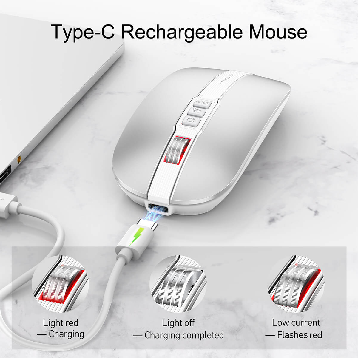 Je gear opgeladen houden hoeft geen giswerk te zijn. Deze muis heeft een Type-C oplaadbare batterij met een duidelijke LED-indicator in het scrolwiel. Tijdens het laden brandt er een rood lampje. Is de batterij vol, dan gaat het lampje uit. En als de batterij te laag wordt, knippert het rode lampje als waarschuwing. Met 400 mAh capaciteit krijg je tot 10 dagen gebruik op één lading, en de meegeleverde 80 cm Type-C kabel maakt opladen snel en simpel.