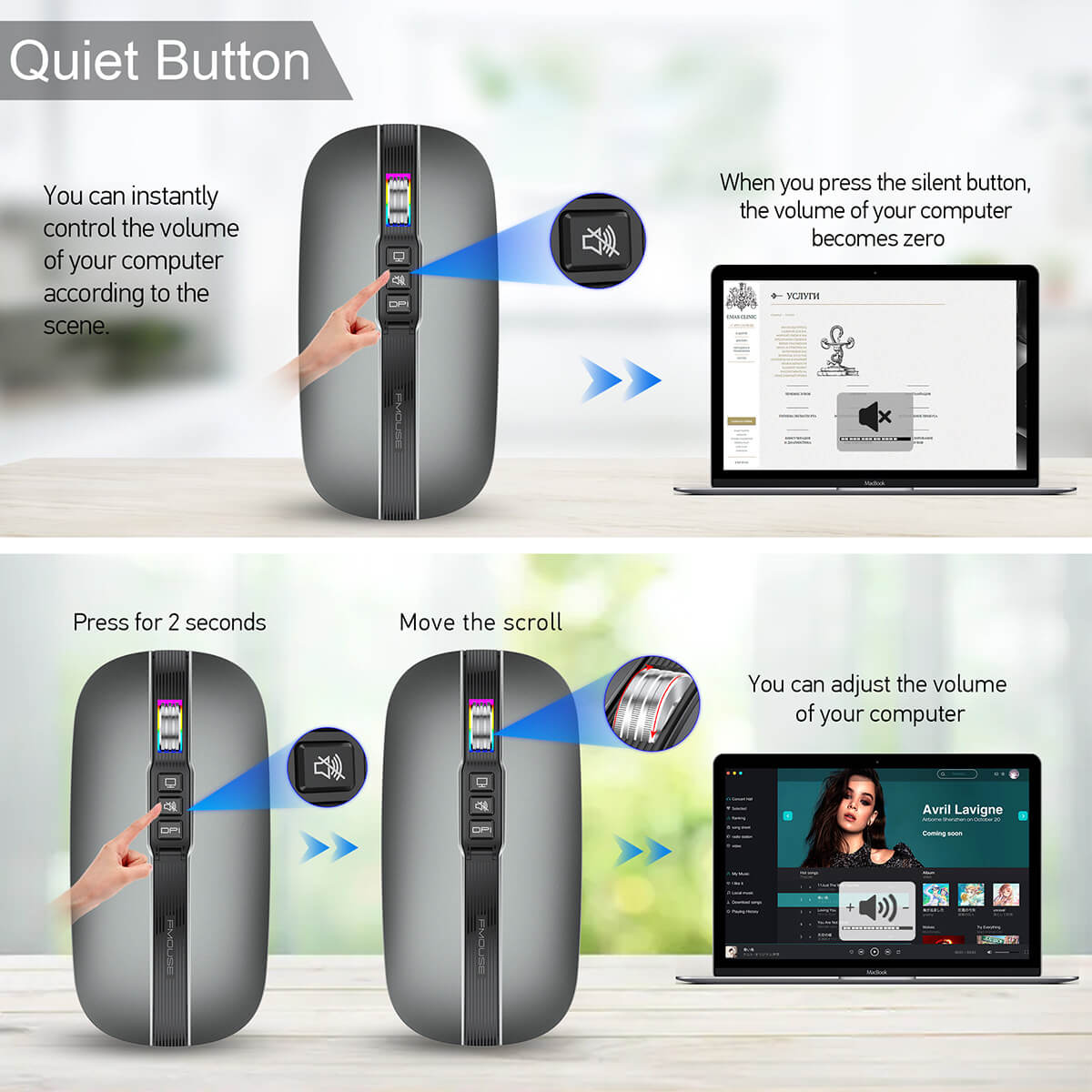 Geen taak is hetzelfde, en je muis hoort dat ook niet zo te behandelen. De Slim Wireless Mouse biedt vier DPI-opties — 800, 1200, 1600 en 2400 — geoptimaliseerd voor verschillende situaties. Digitaal schetsen? Kies 800 DPI voor extra detail. Snel door documenten of presentaties? 1200 DPI is de sweet spot. Voor algemeen gebruik en browsen geeft 1600 DPI net wat meer snelheid, terwijl snelle games of high-res schermen profiteren van 2400 DPI. Houd de DPI-knop lang ingedrukt om het scrolwiel-licht aan/uit te zetten — een stijlvolle touch die bij je workflow past.